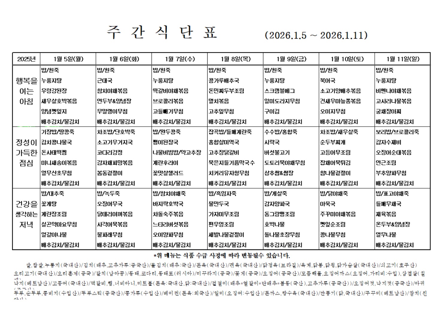 2026년 1월 첫째주 식단표 입니다.