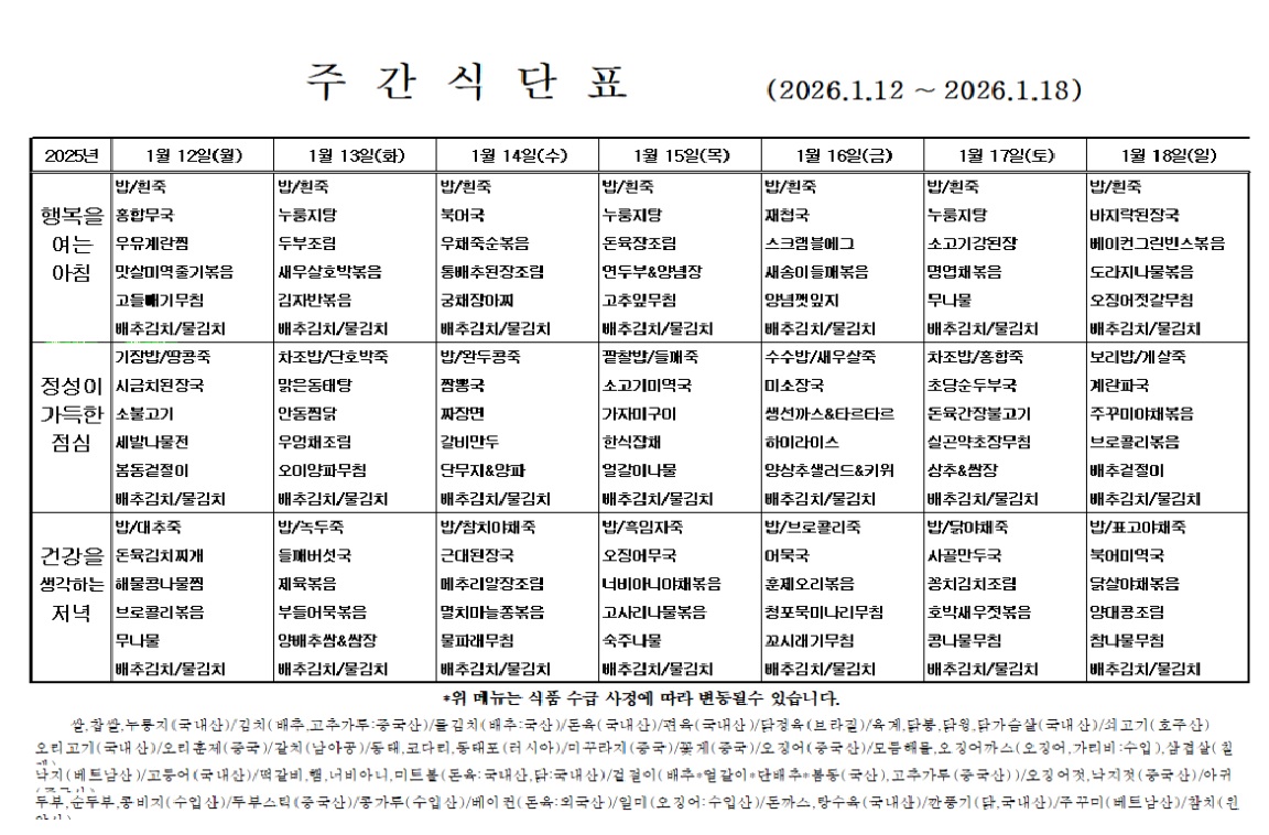 제목 1월 둘째주 식단표 입니다.