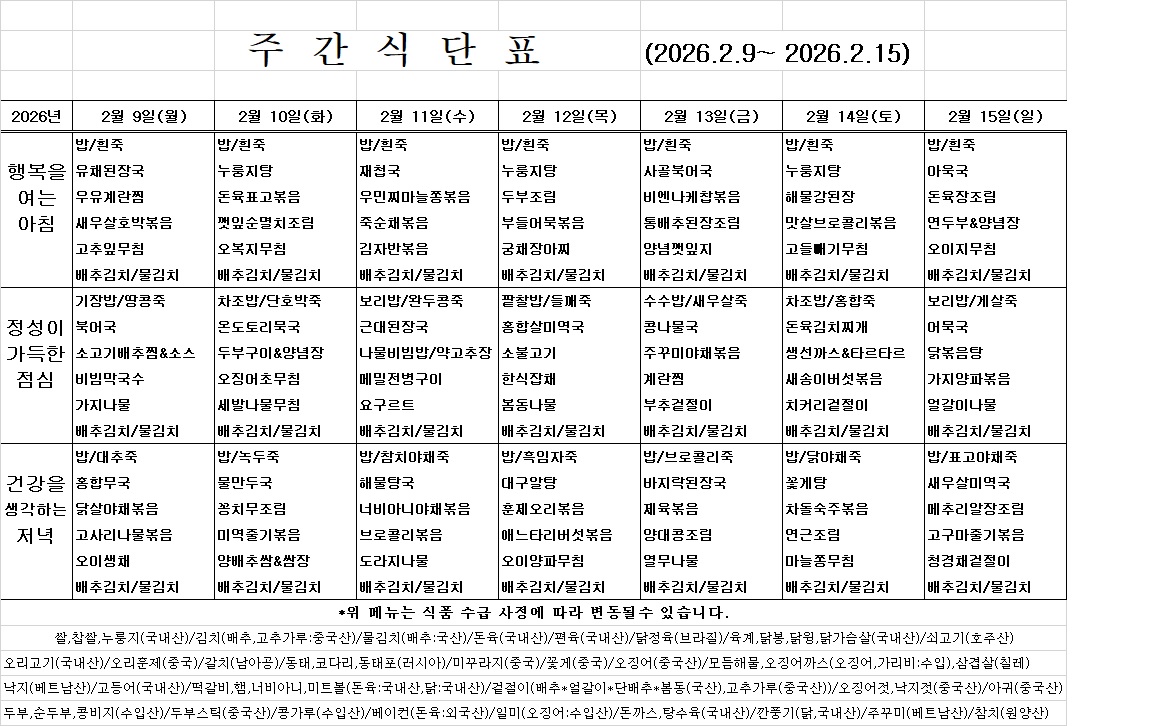 2월 둘째주식단표입니다