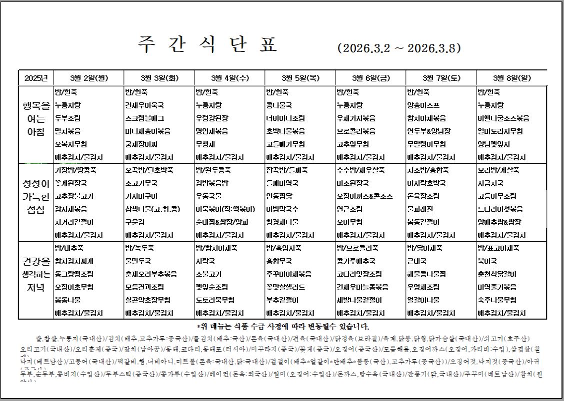 3월 첫째주 식단표 입니다.