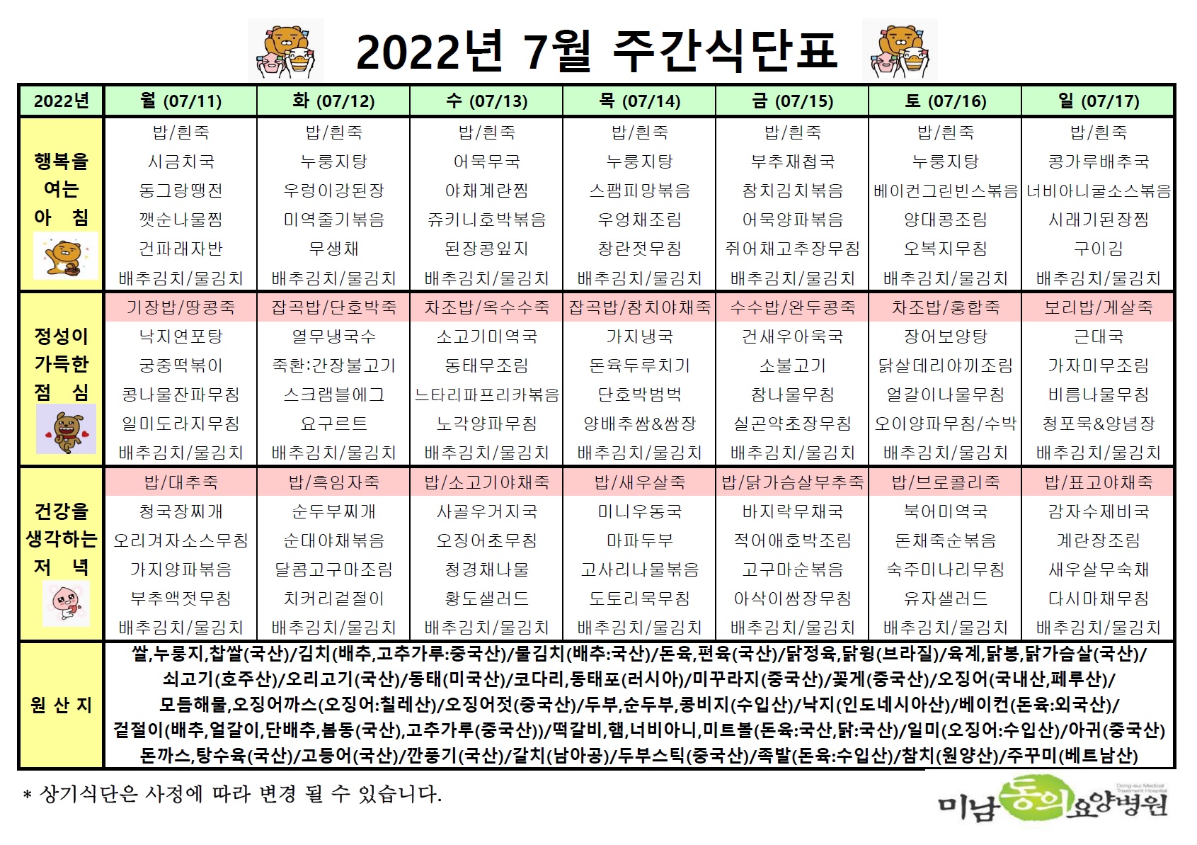 7월 둘째주 식단표입니다.