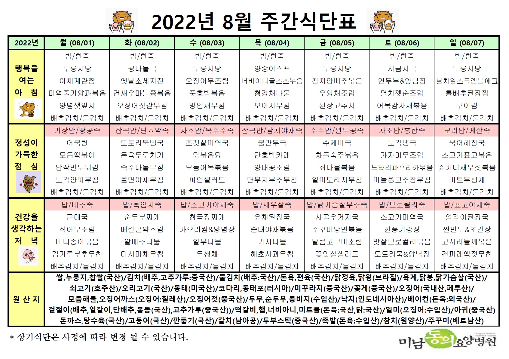 8월 첫째주 식단표입니다.