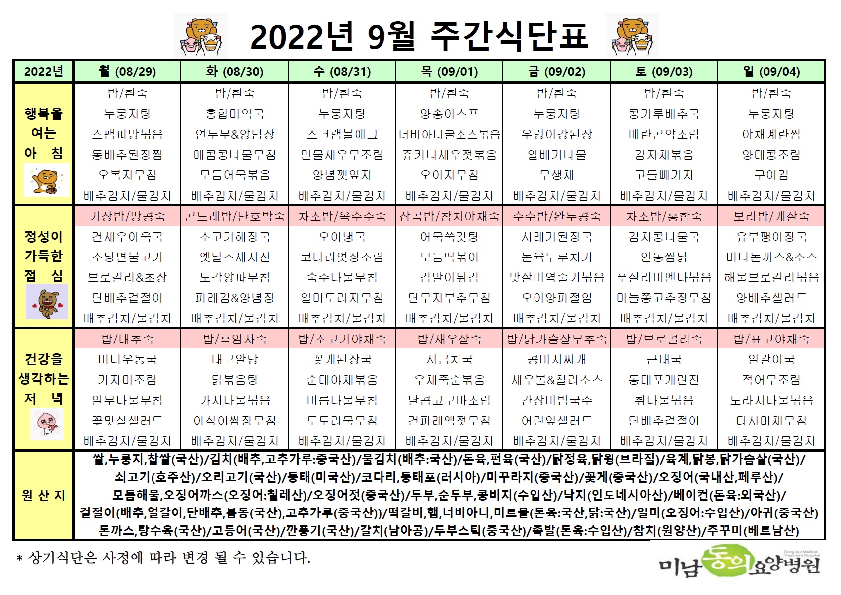 9월 첫째주 식단표입니다.