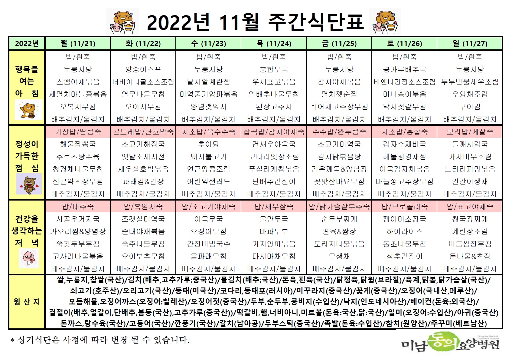 11월 넷째주 식단표입니다.