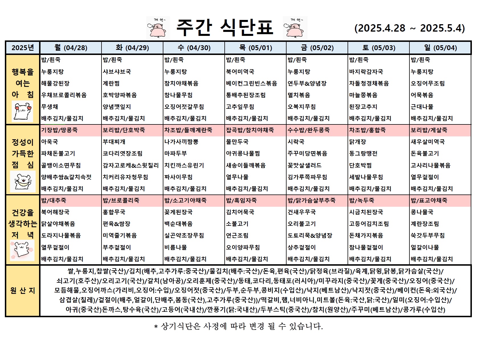 5월 첫째주 식단표 입니다.
