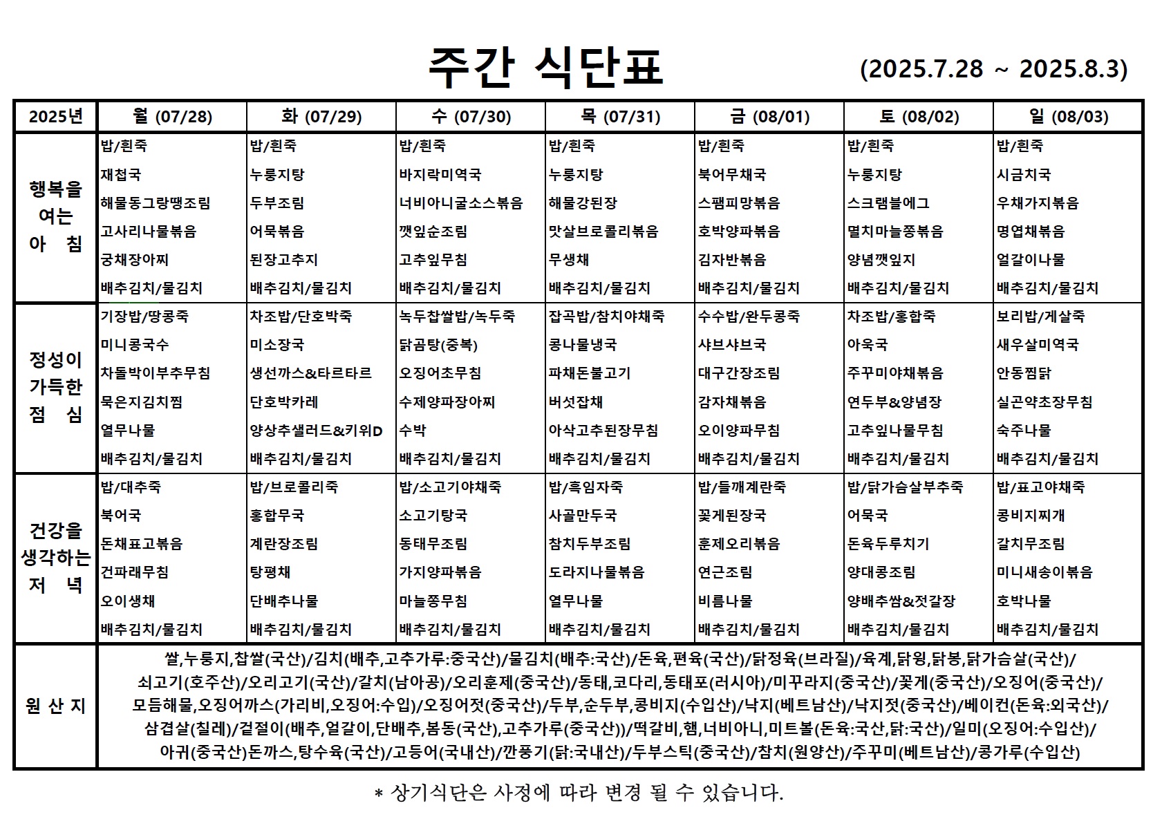 7월 다섯째주 식단표 입니다.